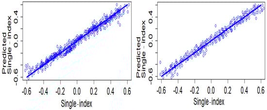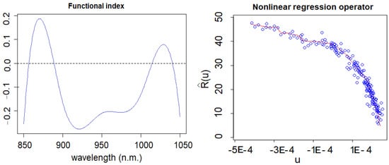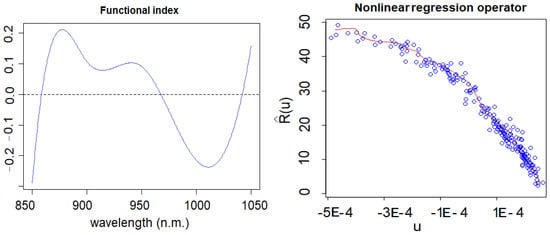 Then, and is the estimator of the single-index coefficient vector of the CVGPLSFIM model. The statistic is the estimated functional single-index, and is the estimated nonlinear regression operator R obtained by the CVGPLSFIM model.