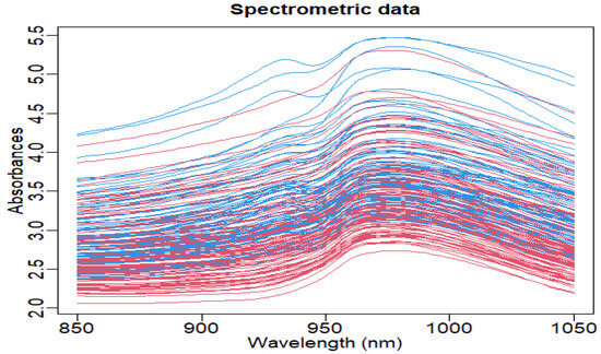 As in Ferraty et al. [], Aneiros et al. [], and Alahiane et al. [,], to value our theoretical results, we consider the public spectrometric data widely used in FDA and that are available at the website http://lib.stat.cmu.edu/datasets/tecator, accessed on 1 March 2024.