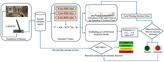 The academic innovation of this study lies in the proposal of a novel algorithm that combines the Hotelling’s T2 index with LSTM for the early detection of motor anomalies. The study adheres to the ISO 10816-1 standards for anomaly detection and integrates them with the T2-LSTM model for prospective anomaly prediction—an approach that is notably absent from the existing literature. The experimental results demonstrate the high prediction accuracy, with a success rate of 98%, thereby validating the model’s effectiveness and practical applicability.