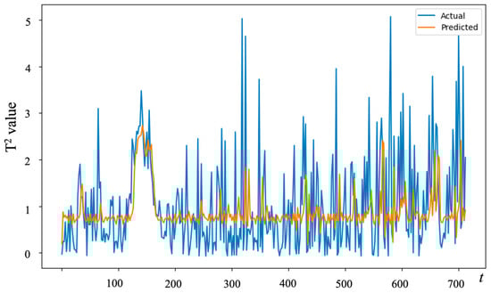 Figure 2 shows the efficacy of the T2-LSTM model in forecasting motor vibration data, as evidenced by the discrepancy between the actual data (Actual) and the model’s projections (Predicted). The blue line represents the actual Hotelling’s T2 index values derived from the motor, which correspond to the vibration status of the motor during operation. It can be observed that the actual data set exhibits discernible fluctuations, characterized by peaks that are indicative of anomalous vibrations. In contrast, the orange line depicts the T2-LSTM model’s projected Hotelling’s T2 index values.