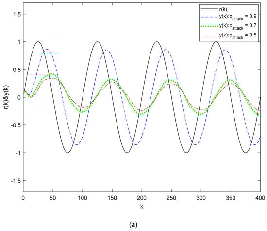 Figure 7 and Figure 8 display the output responses under different packet loss conditions in the reference signal channels, with varying preview conditions. Figure 7a and Figure 8a represent the case without preview, while Figure 7b and Figure 8b correspond to the case with a preview length of . The other parameters used are , , and . By comparing Figure 7a,b, as well as Figure 8a,b, we observe that the tracking error significantly decreases between and , indicating that the preview controller based on the reference signal channel attack-tolerant strategy can mitigate the tracking error between different packet losses in the reference signal channel.