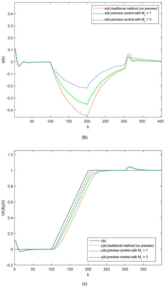 Preview control is a concept that enhances tracking effectiveness and suppresses disturbance by utilizing information about reference signals or disturbances ahead of time [1,2,3]. In a preview control model, measuring these signals in advance and incorporating this “future” information into the controller can save total energy consumption during tracking, thereby improving overall efficiency. Additionally, by applying “future” disturbance information to design a reverse buffer in advance, the impact caused by disturbances can be mitigated. Research on preview control has garnered significant attention, with the augmented error system (AES) being a key technology in the optimal preview control theory [1,2,3]. When designing a preview controller, the AES is first established, which includes the state equation, the error equation, and some equalities regarding previewable signals. Using the maximum principle and solving an equation with previewable signals backwards, an optimal preview controller can be derived. Building upon a fractionation tower model, a series of preview control problems for multi-rate setting systems have been solved [4,5,6]. The core method to address this involves introducing the discrete lifting technique to convert the multi-rate setting system into a single-setting one.