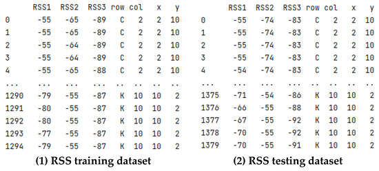 The dataset was designed with AoA and RSSI readings from the sender and the coordinates of each recording point as presented in Figure 10. At each data collection point, multiple entries were recorded. For each data entry, the RSS and AoA values of the transmitter were recorded from three separate receivers. Additionally, the original row and column labels, ranging from “A” to “L” and “1” to “12”, were included. To simplify the location calculations, these coordinates were remapped to integer values ranging from 1 to 12, both horizontally and vertically. These coordinates were utilized for both training the model and subsequent positioning tasks.