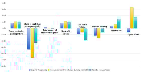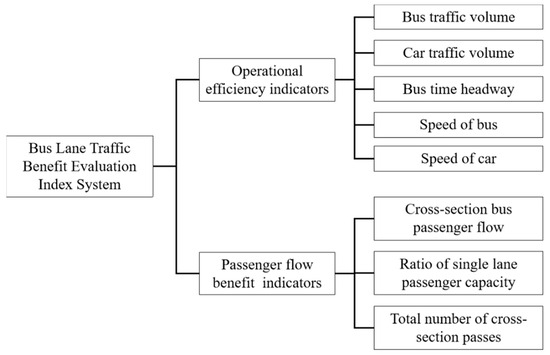 The existing research on the benefit evaluation of bus lanes mostly focuses on three aspects: economic, social, and traffic benefits. Among these, the traffic benefit evaluation reflects the impact of bus lanes on road traffic operation [4]. In view of the evaluation research on the traffic benefits of bus lanes, scholars have mainly focused on evaluation indexes such as vehicle speed, travel time, bus passenger capacity, delay, and reliability. Lei [5], Sekhar [6], and Kampouri et al. [7] evaluated the traffic operation efficiency of bus lanes using VISSIM v8.0 (Karlsruhe, Germany) to compare changes in car delay, bus delay, queuing time, and running time before and after the introduction of bus lanes. Chen et al. [8] established a simulation model using Paramics software v6.4 (Edinburgh, Scotland) and used the running time, speed, peak social vehicle flow, and per capita travel time of buses and general traffic as evaluation indicators. Huo et al. [9] proposed a method to measure the unit delay of bus lanes as an index for evaluating the service level of bus lanes. Ullah [10] constructed a bus lane simulation model using TransModeler v6.0 (Newton, MA, USA) and used individual indicators, such as bus travel speed and non-bus travel speed, to evaluate bus operation benefits.