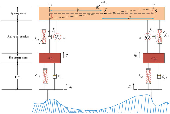 To represent the nonlinear coupling relationship between the front and rear suspensions, a widely used half-car active suspension model is established, as shown in Figure 1, with the symbols defined in Table 1. According to the second kind of Lagrange’s equations, the dynamic equations for the half-car active suspension are as follows [9,10,29,30]: