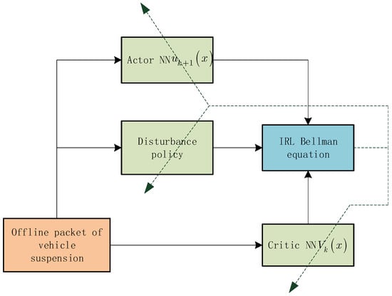 To solve the HJI Equation (16) numerically, this section designs an off-policy RL algorithm. Compared to on-policy RL algorithms, off-policy methods do not require real-time updates, making them safer as they do not affect the actual physical system. Additionally, this method does not require any model parameter information, which can reduce design costs. The algorithm structure is illustrated in Figure 2. In Figure 2, the state data of the active suspension during the vehicle’s operation is first collected as input. The actor and critic neural networks are then employed to learn the solution to the integral Bellman equation online, with the neural network (NN) weights being continuously updated until convergence is achieved. A portion of the active suspension vibration data is extracted and used to update the value function, control policy, and disturbance policy in real time within an actor–critic RL framework.