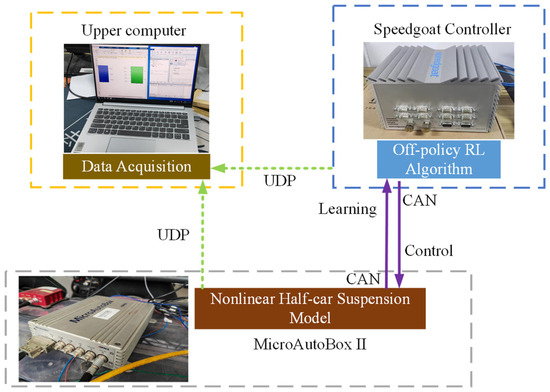 To validate the feasibility of the off-policy RL algorithm for the nonlinear active suspension differential game, this section applies Algorithm 1 for policy optimization. The simulation setup uses a hardware-in-the-loop platform, as depicted in Figure 3. The nonlinear active suspension model runs on the MicroAutoBox II, while Algorithm 1 operates on the Speedgoat Controller. The MicroAutoBox II was purchased from the German company dSPACE. The Speedgoat Controller was purchased from Speedgoat in Bern, Switzerland. The MicroAutoBox II is equipped with an IBM PPC 750GL processor (900 MHz), and the Speedgoat Controller features an Intel Celeron 2 GHz CPU with four cores. Real-time data are displayed on the host computer, and the Simulink program runs concurrently.