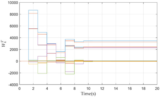 The simulation results are shown in Figure 4, Figure 5, Figure 6, Figure 7 and Figure 8. Figure 4 displays the training results of the critic NN weight coefficients, Figure 5 shows the training results of the actor NN weight coefficients, and Figure 6 illustrates the number of policy updates. It can be observed from the figures that the convergence condition is met after 10 updates. Given the sampling time of 0.01 s, the total update time amounts to 13.2 s. Notably, the control and disturbance inputs required for data collection are random white noise signals, which do not necessitate a specific functional form, thereby offering greater applicability. Figure 7 and Figure 8 illustrate the control and disturbance inputs during the data collection process, demonstrating that small inputs are sufficient to meet the requirements. This method ensures the safety of real vehicle data collection.