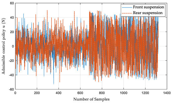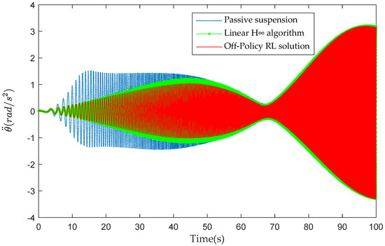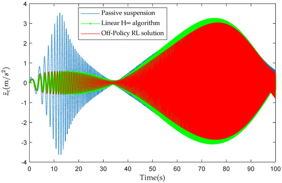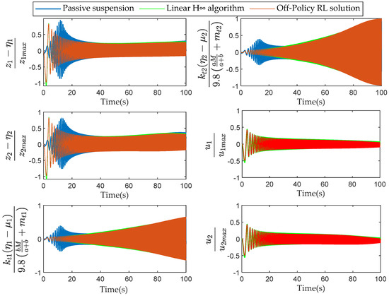 Table 4 provides the peak values for . As evident from Table 4, the off-policy RL solution meets the constraint condition, i.e., . In contrast, the linear H∞ algorithm’s suspension travel index exceeds the constraint value, resulting in a loss of constraint effectiveness. This occurs because the linear H∞ method does not account for system nonlinearities, leading to certain indicators being uncontrolled.