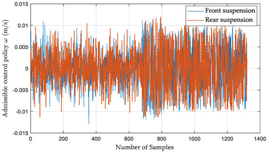 Figure 9 shows the road excitation profile, Figure 10 displays the pitch acceleration of the vehicle, Figure 11 illustrates the vertical acceleration of the vehicle body, and Figure 12 presents the response of the suspension performance constraints. From Figure 10 and Figure 11, it can be observed that the trained control policies effectively attenuate vibrations in the frequency range of 0.1–6 Hz, corresponding to vehicle speeds below . For intelligent driving vehicles equipped with visual sensors, vehicle speed can be controlled and planned according to road conditions [1]. Figure 10 and Figure 11 show that, in terms of ride comfort, the off-policy RL solution outperforms traditional linear H∞ algorithm and passive suspension system. This advantage arises from the method’s ability to account for system nonlinearities, resulting in more effective control performance. Notably, this method requires no model information. Figure 12 indicates that the suspension travel index of the linear H∞ algorithm exceeds the maximum limit, whereas the proposed method consistently remains within a reasonable range. Additionally, Figure 12 demonstrates that all constraint indicators of the proposed method are less than 1, thereby satisfying the physical constraints during actual driving conditions.
