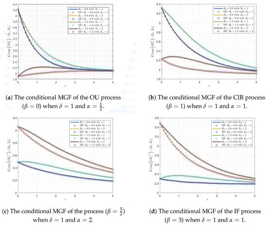 In Table 1, we present a comparison between a closed-form Formula (4) and Monte Carlo (MC) simulations for the conditional moment-generating function (MGF) of an Ornstein–Uhlenbeck (OU) process. The comparison is quantified by using the mean absolute deviations (MADs). The OU process parameters are set to , , with an initial value . The table explores two initial states () and four-time points (τ = 1, 5, 15, and 15). For each combination, MC simulations are run with increasing numbers of paths (5000, , , and ) to assess convergence. We can see that the closed-form formulas and the MC simulations provide highly accurate results, thus verifying the formula’s reliability and resilience. Furthermore, the accuracy of the MC simulations improves as the number of paths increases, although this comes at the expense of a longer computing time.