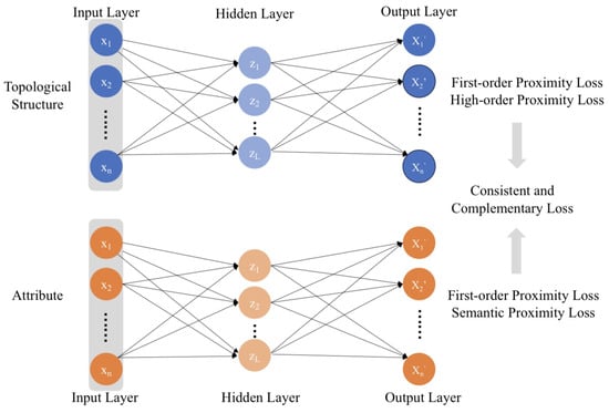 The first autoencoder for the embedding of the topological structure is trained with the objective of minimizing the construction loss of the high-order proximity (Given an attributed network , where E is the adjacency matrix of all nodes in the network, A denotes the attribute matrix. is the high-order proximity matrix, where is the 1-step probability transition matrix of adjacency matrix E. The high-order proximity of any two nodes in the network depends on the similarity of their high-order proximity matrices. If two nodes share a similar neighborhood, they are similar.) and maximizing the likelihood estimation of first-order proximity ( denotes the j-th element in the i-th line in the adjacency matrix. is the distance between the i-th node and the j-th one in the network. A larger value of indicates more similarity between two nodes. If two nodes are connected, they are similar, which ensure both global and local structures):