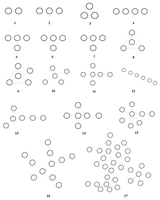 Considering the fact that connected subgraphs have different structures due to their different connection modes even if they share the same number of nodes, this study classified subgraphs based on node degrees. Taking a three-node subgraph as an instance, it had two different structures. One was circular, while the other was linear. The node degree lists were and , respectively, which allowed differentiation between these two structures. Table 4 shows the statistics on the classification of the connected subgraph’s structural pattern. Figure 2 is a schematic of each type of structural pattern.