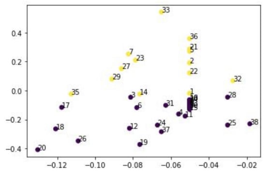 From Table 4 and Figure 2, it is obvious that the RPT network represented by the adjacency matrix was high-dimensional and sparse. Therefore, it could not be directly used as an input for machine learning tasks such as classification and regression. This study employed network embedding algorithms [,] to represent structural features of nodes using vectors in the low-dimensional and dense space. In the meantime, local and global structures were well preserved. Then, the adjacency matrix was fed into SDNE to learn a two-dimensional vector representation. The values of the vector in two dimensions were and , respectively, both of which were input into credit risk-evaluation models.