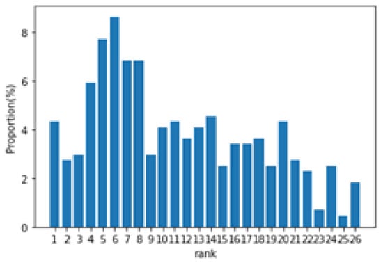 In addition to the macro-feature importance, this study further analyzed the statistics of the feature importance for each sample. In Figure 5, the horizontal axis stands for the importance rankings of the RPT network features. The vertical axis shows the proportions of samples whose RPT features had a specific importance ranking.