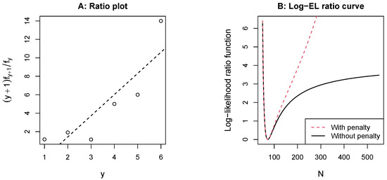 (A) The ratio plot depicts the relationship between the frequency () of capture counts (y), where the dashed line represents the fitted linear model. (B) The log-EL ratio curve shows the profile empirical log-likelihood ratio functions with penalty (red dashed line) and without penalty (black solid line) of the abundance.