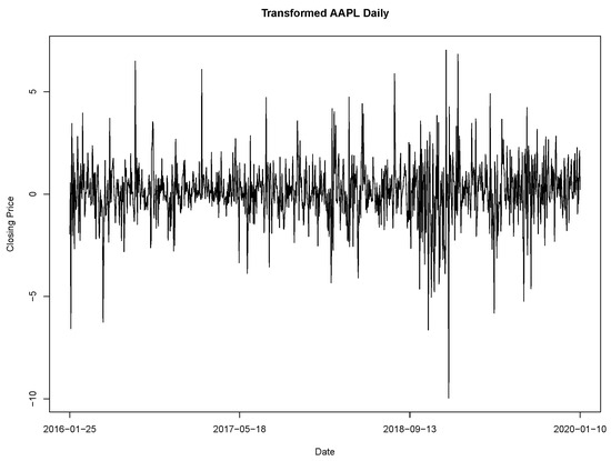 Nonetheless, most real-world measurements vary from the standard normal distribution. The theoretical lognormal distribution for stock prices has a slight skew to the positive side, because there is an inherent upward bias in stock prices (for further details see [14]). This is because, since the turn of the century, stocks have appreciated at approximately a 5–10% annual rate; this is partly due to inflation (or even to investor overconfidence), but it is also due to increases in productivity, or the economic surplus society generates (for further details see [15] and/or [16]). Thus, the skewing in the positive side of the theoretic lognormal is understandable. Also, note that factors that have a bearing on assets’ prices, such as wars, depression, peace, prosperity, oil shortages, foreign competition, market crashes, pandemics and so forth, are all contained in its data. So, henceforth, we will consider that all the data used is transformed using the percentage change transformation, i.e., we will apply the Percentage Returns transformation , so each entry on the obtained datasets represents the percentage return from the previous iteration to the present one. Thus, we will apply all of our models to this transformed data. For example, the transformation applied to the previous datasets yields the following Figure 5, Figure 6, Figure 7 and Figure 8: