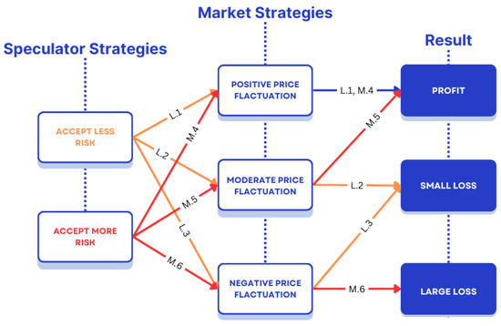 Visual representation of possible outcomes considering the speculator’s risk levels and the market’s price movements.