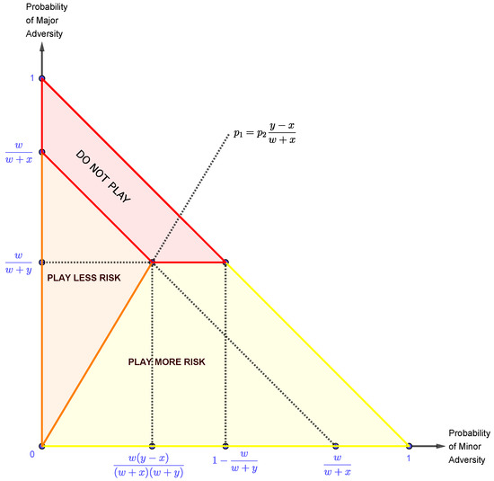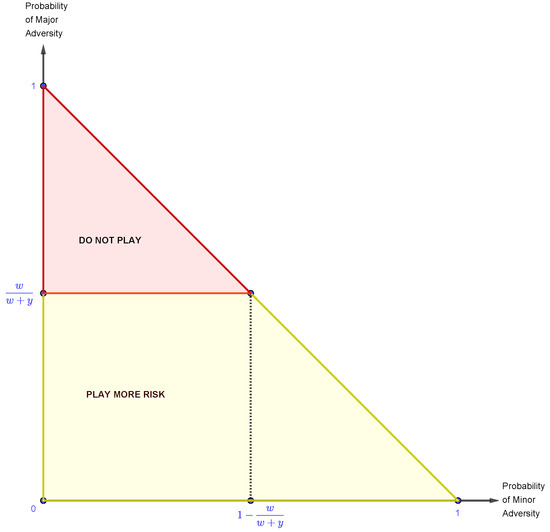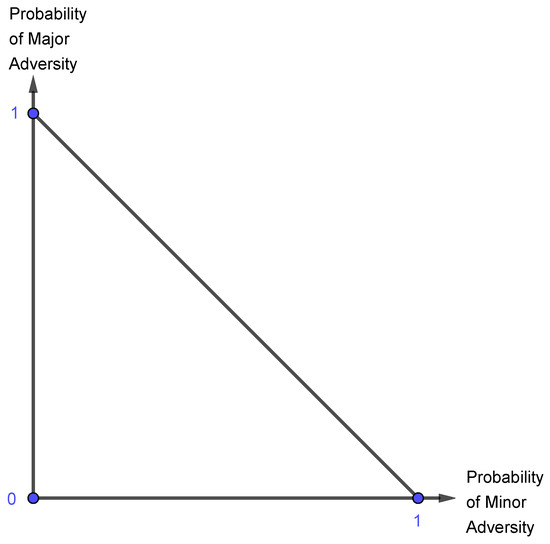 This notation is in terms of the probability that either event will occur and, because the market is playing mixed strategies, the sum of the probabilities of playing all of the strategies must equal 1. Therefore, if the market plays Minor Adversity with a probability of and Major Adversity with probability , then it follows that Zero Adversity occurs with a probability of .