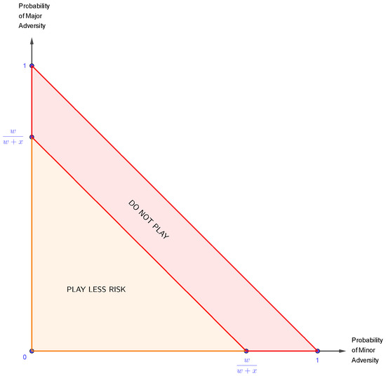 Note that, with the previous assumptions, we have a game against nature where we assume Wald’s (max–min) Criterion (for more details check [19,20,27] and/or [30]). That is, we apply Wald’s (max–min) Criterion to model the interaction between the speculator and the market within a game against nature framework, where we assume the market acts adversarially, aiming to minimize the speculator’s gains while the speculator aims to maximize their profit under the worst-case scenario of market behavior. This approach helps determine a strategy that guarantees the best possible outcome for the speculator, even in the face of unpredictable market fluctuations.