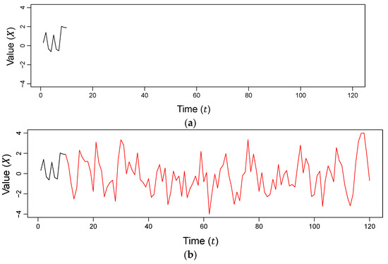 Analysis and prediction of time series data. (a) Observed time series data example (initial observed data points in black) and (b) predictions utilizing data-generating process (initial data points in black extended with predictions in red).