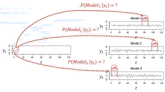 These questions serve to frame our examination of model selection and the application of Bayesian principles to resolve uncertainties in the cold-start scenario. We propose that the time series could originate from one of several candidate models. This setup requires knowledge of these models and introduces a Bayesian model selection scenario, where we must decide which of the competing models is the most probable given the data. This decision process is demonstrated in Figure 3, which displays probabilities of the observed time series data belonging to different candidate models.