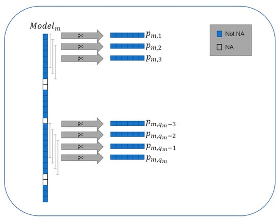 - Data for each candidate model are partitioned. This study followed the method described in Section 3.2 to partition data from each candidate model (designated as pm). If M candidate models exist, M partitioned datasets pm are also generated. If the length of observed data is u, each partitioned dataset is also set to length u. If data are standardized, standardization is applied separately to each pm;