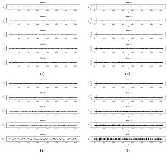 Visualization of the data splitting process for different time series models. The red vertical line separates the observed data on the left from the data used to generate the split datasets on the right. (a) Type A: AR(1); (b) Type B: AR(2); (c) Type C: MA(1); (d) Type D: MA(2); (e) Type E: ARMA(1); and (f) Type F: ARMA(2).