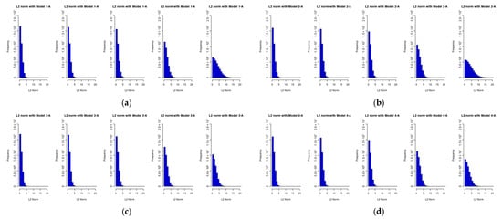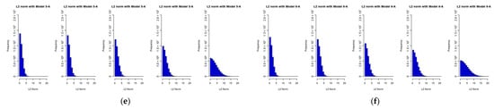 Histograms of L2 norms for different model types. (a) Type A: AR(1); (b) Type B: AR(2); (c) Type C: MA(1); (d) Type D: MA(2); (e) Type E: ARMA(1); and (f) Type F: ARMA(2).