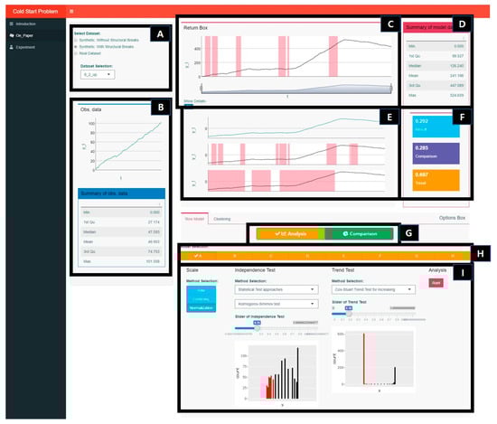 Components of the visualization framework for statistical analysis: (A) dataset selection via a dropdown menu; (B) time series graph of observed data and a summary of the observed data; (C) plot of selected model data; (D) summary statistics of the selected model data; (E) detailed view for the scaled model data, independent test results, and trend test results; (F) display of marginal likelihoods for the combined results of independent test and trend test, the independent test result, and the trend test result; (G) buttons for selecting either “Analysis” or “Comparison”; (H) options for selecting candidate models; and (I) settings for “Scale”, test methods, significance level adjustments, and a “Run” button to execute the analysis.