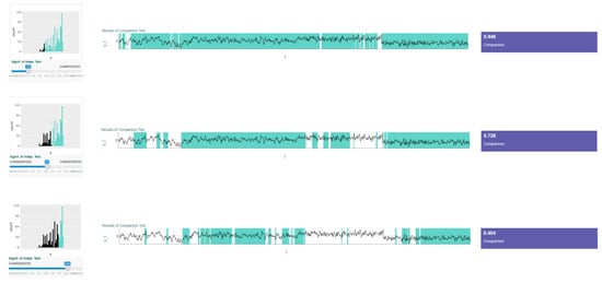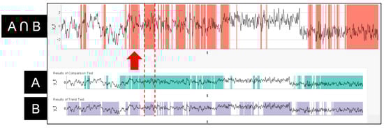 In particular, when employing distance to compute p[X|Modelm], as illustrated in Equation (3), it is essential to initially ascertain whether r(pm,j, X) ≤ SignIf.indep. with the candidate model. This can be accomplished by graphically representing the candidate model as a line graph and then highlighting sections that meet this criterion in a specific color, as depicted in Figure 13 “A”. If the method to compute p[X|Modelm] involves statistical tests rather than distance, as indicated in Equation (4), it is also necessary to determine whether p-valuetrend(pm,j) ≤ SignIf.trend. These sections can be independently highlighted, as shown in Figure 13 “B”. Consequently, by visualizing both [indep.(pm,j, X) ≤ SignIf.indep.] and p-valuetrend(pm,j) ≤ SignIf.trend, as shown in Figure 13 “A∩B”), it becomes easier for users to identify sections of the data that are considered similar to the observed data.