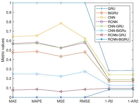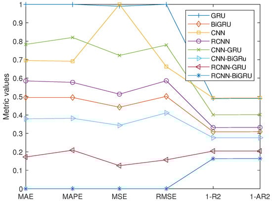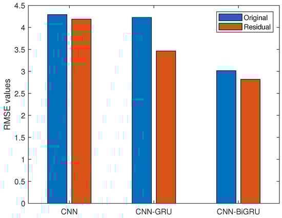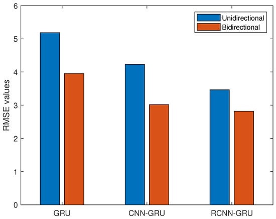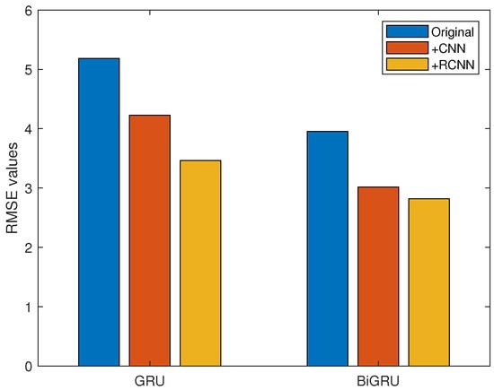 To verify the effectiveness of the residual structure for CNN networks, a CNN is compared with an RCNN, a CNN-BRU with an RCNN-GRU, and a CNN-BiGRU with an RCNN-BiGRU. The results are shown in Figure 10. Focusing on the figure, the introduction of the residual structure in CNN reduces the values, which shows that the employment of the residual structure is beneficial to improving network performance.