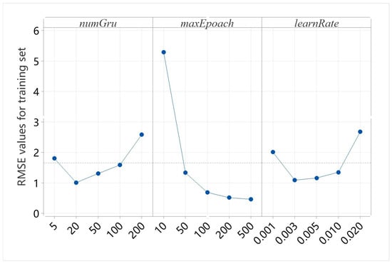 As you can see from those figures, the network performance is degraded when the number of nodes in the GRU layer is too large or too small with values in the range of 10 to 25 being optimal. With the increase in the maximum number of training times, the value gradually decreases. When it is greater than 100, the increase in the maximum number of training times is not obvious to the network performance improvement, which means that the learning is basically completed at this time. As a result, the maximum number of training times can be set to a fixed value and is no longer used as an optimization variable. When the learning rate is less than 0.001 or more than 0.01, the performance of the network decreases drastically, so the optimal value of the learning rate ranges from 0.001 to 0.01.