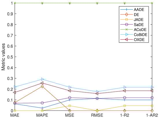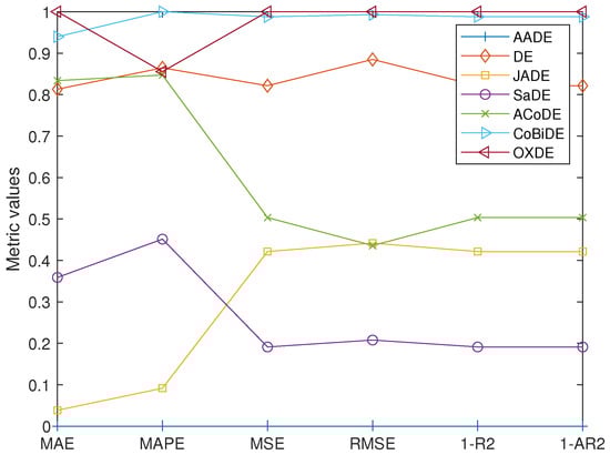As can be seen from Table 5, the sorting numbers of each algorithm on every metric are placed in brackets. Based on the average ranking results of all metrics, the JADE algorithm is the best on the training set, which is followed by the DE and AADE algorithms. Next are SaDE, OXDE, and CoBiDE, respectively, and ACoDE is the least effective. Specifically, the DE algorithm is best on four metrics, , , and , while the JADE algorithm performs best on the remaining two metrics. The AADE algorithm raised in this paper obtained suboptimal results on two metrics and ranked 3rd on four metrics. From the above analysis results, it can be concluded that the results of AADE on the training set are not the best but relatively advanced compared to other algorithms.