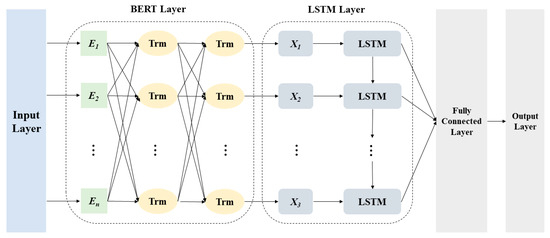 The input layer receives preprocessed sample features and forwards them to the BERT layer. Through the BERT pre-training model, input text sequences are transformed into their respective word embedding representations, which are then passed to the LSTM layer. Leveraging its feedback memory capability, the LSTM network extracts feature relationships between the context and words, thereby capturing sequential information in text by learning both long-term and short-term dependencies. Subsequently, the fully connected layer amalgamates the previously extracted features and maps them to a higher-dimensional feature space, enhancing their suitability for classification or regression tasks. Lastly, the output layer generates the final prediction results, utilizing the softmax function to convert the output values of the multiclassification into a probability distribution ranging from 0 to 1, summing up to 1 [25]. This distribution represents the probability of the different categories.