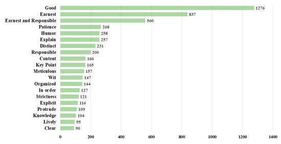After preprocessing the text data, the essential vocabulary can be extracted from the subjective assessment data. By conducting a simple word frequency count, the top 20 words with the highest occurrences are identified, as depicted in Figure 5.