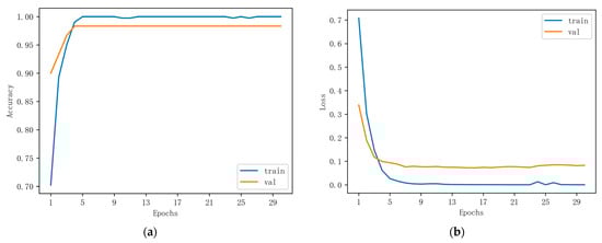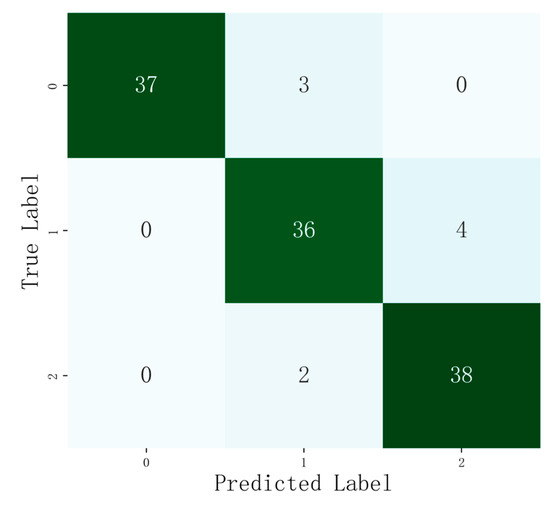 Following model training, we derive the prediction accuracy values for both training and validation datasets, showcased in Figure 8a. Additionally, Figure 8b illustrates the prediction loss values for the training and validation datasets. The training accuracy of the model shows an initial sharp increase followed by a gradual leveling off, reaching a peak of 100%. Similarly, the validation accuracy demonstrates rapid growth in the early stages, peaking at 98.33% by the fourth iteration. The validation loss value fluctuates within a certain range after an initial rapid decrease. Considering both the training accuracy and the magnitude of the loss value, we designate the network model parameters from the 14th iteration as the optimal parameters.