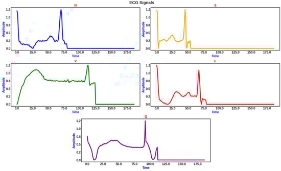 Our study dataset is primarily centered on the open-access MIT-BIH arrhythmia dataset, which comprises 48 30-minute ECG recordings of 47 individuals [31]. The 109,446 ECG beats in the recordings have been manually annotated beat-by-beat by experts into multiple distinct arrhythmia classes [47]. We downloaded the ECG beats from Kaggle [48], which have been segmented and individually mapped to the five classes of the Association for the Advancement of Medical Instrumentation (AAMI) standard classification framework—normal (N), supraventricular (S), ventricular (V), fusion (F), and beats of unknown etiology (Q)—(Table 2) [47,49]. Due to variations in the lengths of the extracted ECG beats, we employed zero padding to ensure a uniform fixed length of 187 for the analyzed ECG segments (Figure 1), as previously described [40,46]. These pre-processed ECG segments constituted our study dataset.