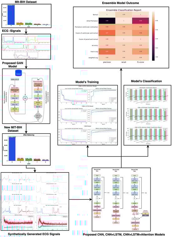 Our model is illustrated in Figure 3. To address data imbalance, we proposed to use GAN to generate synthesized ECGs and extend the representation of minority arrhythmia categories in the MIT-BIH-derived study dataset. The generated synthetic data were then partitioned into training and testing sets, ensuring that the model would be tested on unseen data separate from the training set, thus preempting bias. For end-to-end model training and classification, we employed three deep learning architectures: (1) a convolutional neural network with skip connections (SkipCNN), the foundational unit of our proposed model, which, by incorporating skip connections, enables the network to skip one or more layers to facilitate the more efficient capture of both local and global features; (2) SkipCNN+LSTM, a hybrid model that combines the capabilities SkipCNN and LSTM to process spatial and temporal information, respectively; (3) SkipCNN+LSTM+Attention, which integrates an attention mechanism to the hybrid model to boost model performance through selective emphasis on and capture of pertinent information in the input data; and (4) an ensemble model, which leverages the complementary strengths of different model architectures to improve model accuracy for arrhythmia detection. The proposed models, SkipCNN, SkipCNN+LSTM, SkipCNN+LSTM+Attention, and Ensemble, are mathematically defined by Equations (31), (32), (33), and (34), respectively.