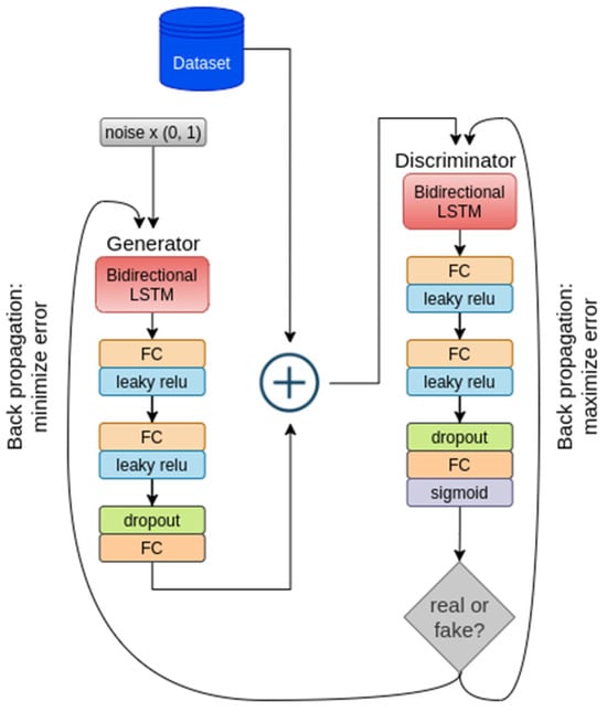 We designed a novel GAN architecture based on Bi-LSTM for generating minority ECG samples, which comprised two primary components: a generator and a discriminator, both utilizing Bi-LSTM networks (Figure 4).