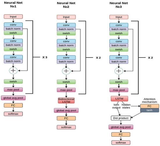 The SkipCNN+LSTM model (Neural Net No.2) combines SkipCNN and LSTM. The SkipCNN component comprises two ConvNormPool blocks. Each ConvNormPool block contains three 1D convolutional layers (Conv1d)—each of kernel size 5—that are augmented with batch normalization layers (BatchNorm1d) and Swish activation functions to facilitate feature extraction and maintain training stability. Max-pooling layers, each of kernel size 2, are added. Notably, a skip connection is incorporated between the first and second convolutional layer blocks to ensure smooth gradient flow and preserve crucial information. The LSTM component comprises a Bi-LSTM of hidden size 64, which allows the model to consider both past and future contexts during learning, enhancing the ability to recognize intricate temporal patterns and relationships within the ECG signals. The overall model architecture is completed with a fully connected layer (fc)—with kernel size 5 and hidden size 64—which aggregates features to make final predictions. It benefits from both bidirectional processing and skip connection; the former allows the model to capture temporal information from both directions in the sequential data, and the latter facilitates the retention of essential information from earlier stages of feature extraction. The SkipCNN+LSTM+Attention model (Neural Net No.3) adds an attention mechanism to the above. Similar to the aforementioned models, the SkipCNN component comprises two ConvNormPool blocks, within each are three 1D convolutional layers (Conv1d) with kernel size 5, batch normalization layers (BatchNorm1d), and Swish activation functions. Max-pooling layers, each with kernel size 2, are included to downsample the feature maps. A skip connection between the first and third convolutional layers enhances the model’s gradient flow while preserving vital information. After the third block’s max-pooling layer, an attention layer (attn) is integrated. Attention mechanisms have proven effective in focusing on specific portions of the input sequence that are most relevant for making predictions. In this case, a linear layer is used to implement the attention mechanism, enabling the model to dynamically weigh the importance of different elements within the ECG signal. An LSTM layer (which is not bidirectional), configured with a hidden size of 64, is incorporated, allowing the model to capture temporal patterns in a unidirectional manner. The architecture is completed with a fully connected layer (fc), with kernel size 5 and hidden size 64.