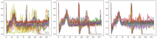 Generation of ECG beats of the S class by the GAN model. Each graph depicts overlayed synthetic ECG signals with uniform fixed length (size 187) in common with the pre-processed input ECG signals; the graphs are shown from left to right and top to bottom in the temporal sequence of the generated signals at intervals of 900 training epochs. Compared with the beginning of training (top left graph), the synthetic signals demonstrate more convergence toward the end of training (bottom right graph).