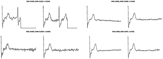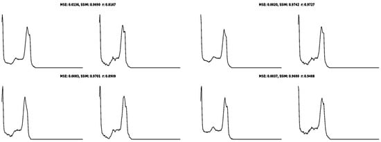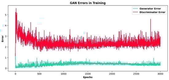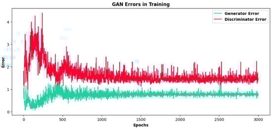 We input 2085 and 460 ECG signals of the S and F AAMI classes, respectively, to the GAN model to generate synthetic ECG signals of these two minority classes. The training was conducted over a total of 3000 epochs to refine the GAN model. For the synthesis of ECG beats of the S class, with an increasing number of training epochs, the generated ECG signals converged (Figure 6) and became more similar to the original ECG signals (Figure 7) with demonstrable progressive decremental discriminator training error (Table 4 and Figure 8). This signifies the GAN model’s ability to capture the underlying patterns and characteristics of the target S ECG class. Of note, the training time expended for each set of 300 epochs remained relatively constant throughout the training process (Table 4), suggesting that the training and signal generation processes were able to maintain a consistent uniform pace throughout, underscoring the model’s reliability.