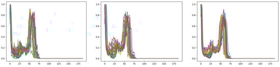 Generation of ECG beats of the S class by the GAN model. Each graph depicts overlayed synthetic ECG signals with uniform fixed length (size 187) in common with the pre-processed input ECG signals; the graphs are shown from left to right and top to bottom in the temporal sequence of the generated signals at intervals of 900 training epochs. Compared with the beginning of training (top left graph), the synthetic signals demonstrate more convergence toward the end of training (bottom right graph).