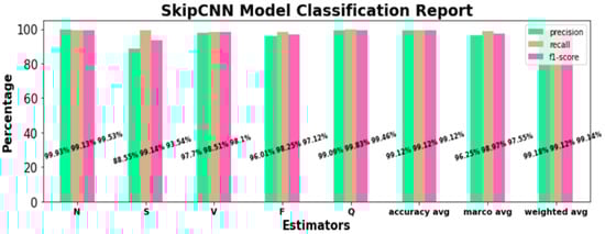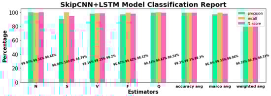 The ability to synthesize realistic ECGs is a distinct advantage of our ECG generation model that combined GAN with Bi-LSTM. The latter confers the model with the ability to process preceding and subsequent data points efficiently, which enables the GAN to synthesize ECGs with a high degree of matched similarity to real ECGs of the minority classes. By integrating the synthetic ECGs with the ECG training, the data imbalance was ameliorated, and a consistent train–test split was obtained across all ECG classes, which enhanced the model training. As a result, our model yielded superlative classification performance for the individual arrhythmia classes, as well as across all classes, which outperformed many extant models. Among our proposed models, the ensemble model, with 99.60% accuracy, emerged as the top performer; more noteworthy is the fact that all our models consistently attained precision, recall, and F1-score values exceeding 99%, underscoring the accuracy and robustness of our GAN plus SkipCNN-based classification approach to arrhythmia detection.