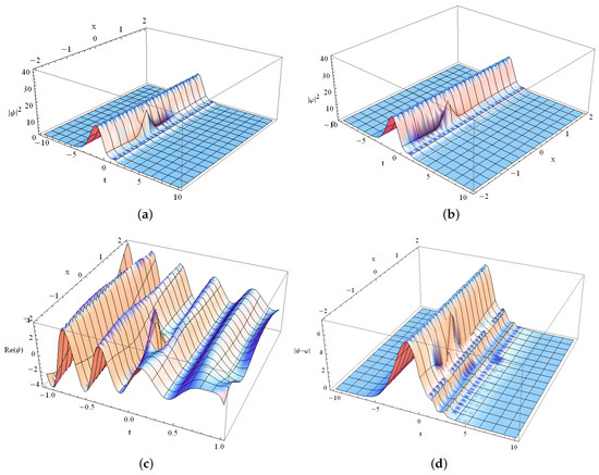 Then, according to Theorem 2, the system admits the explicit solutions given by Equations (56) and (57) with the functions
