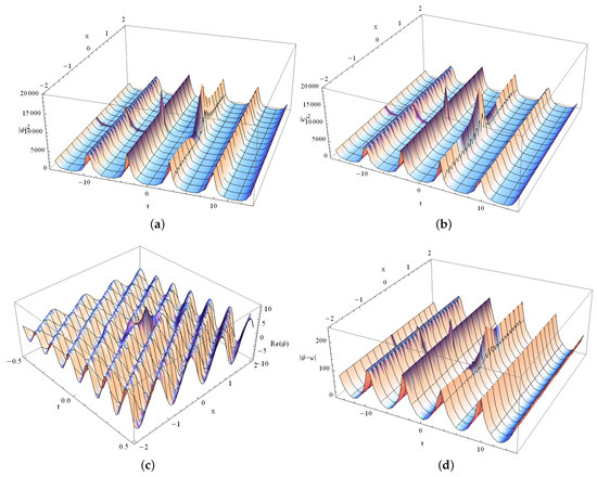 where , , , , , and are given by Equations (A1)–(A13) set out in the Appendix A. Therefore, the existence of these kinds of solutions (DB and rogue wave solutions) are established by letting and be the solutions discussed in the previous section; see Equations (5)–(10). □