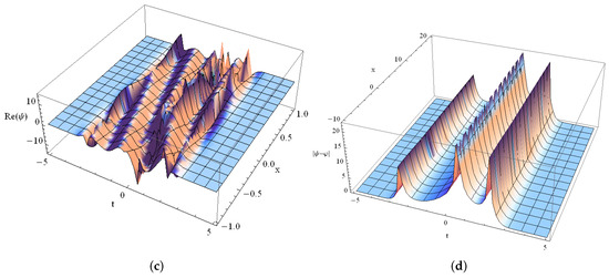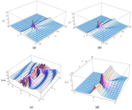 where and are given by Equations (7) and (8). The profiles of these solutions for the parameters and are shown in Figure 1a,b. The real part of the function is displayed in Figure 1c. Figure 1d shows the difference between the two solutions to show that they are different.