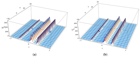 In general, the study of n-dimensional coupled NLS systems is carried out by degenerating them into the one-dimensional coupled NLS ()see for example [41,42] for the two-dimensional case), or directly dealing with the high-dimensional system, as can be seen in [43] for . In contrast, our transformation does not reduce the spatial dimension of the system, and then, to find soliton solutions for (75) and (76) in terms of Theorem 3, we used the ideas given in the works [41,42,43].