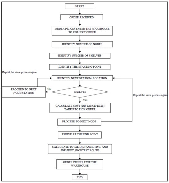The process starts with the order notes, and the order picker will start picking accordingly. The items needed are referred to as nodes and the nearest node to the picker is denoted as the starting point. Then, from the starting point, the picker will identify the next location near to the current station and the process continues until all the items are collected. The shortest distance and path are provided for the pickers to help them minimise the waiting time of the customers. The procedure stops when the picker leaves the warehouse.